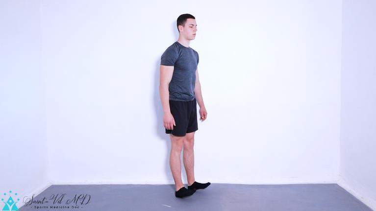 Stand in an upright positing while facing the wall.