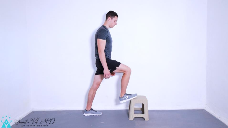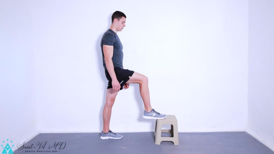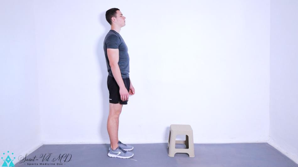 Step on the fall with a toe while the heel of the same foot is resting on the floor. Bend slightly forward to apply greater pressure and stretch the soleus. Then repeat for the other leg.